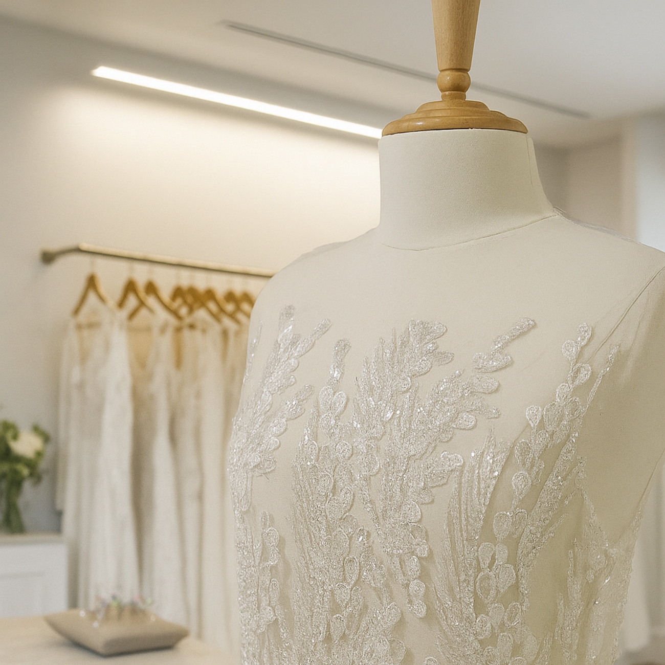 Tout commence par une conversation, un échange autour de la vision, du style et de la personnalité de la future mariée. Lors de ce premier rendez-vous, en présentiel ou à distance, nous définissons ensemble l'univers souhaité, les formes, les matières et les détails.