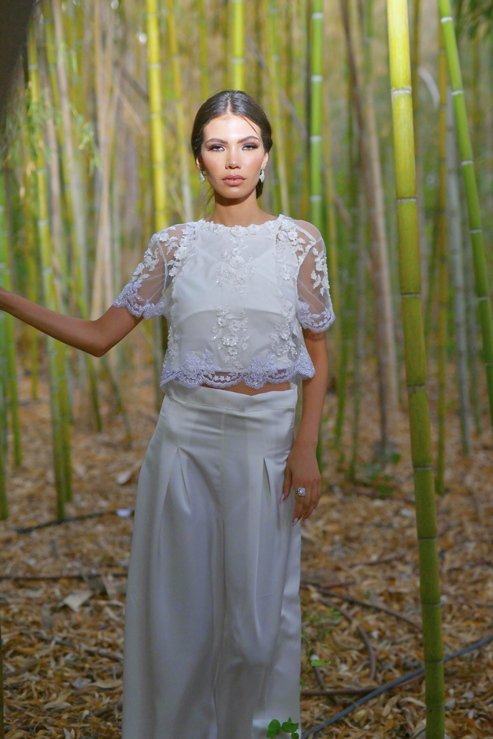 Ayline dévoile une élégance libre. Un top en dentelle brodée, terminé par un ourlet « sfifa » pour une touche de raffinement. Il s’associe à un pantalon en drap de soie fluide qui allonge la silhouette avec modernité. Une création pensée pour sublimer la mariée lors d’un mariage civil, d’une cérémonie intime, d’une soirée élégante ou de tout instant où l’élégance se veut inoubliable.