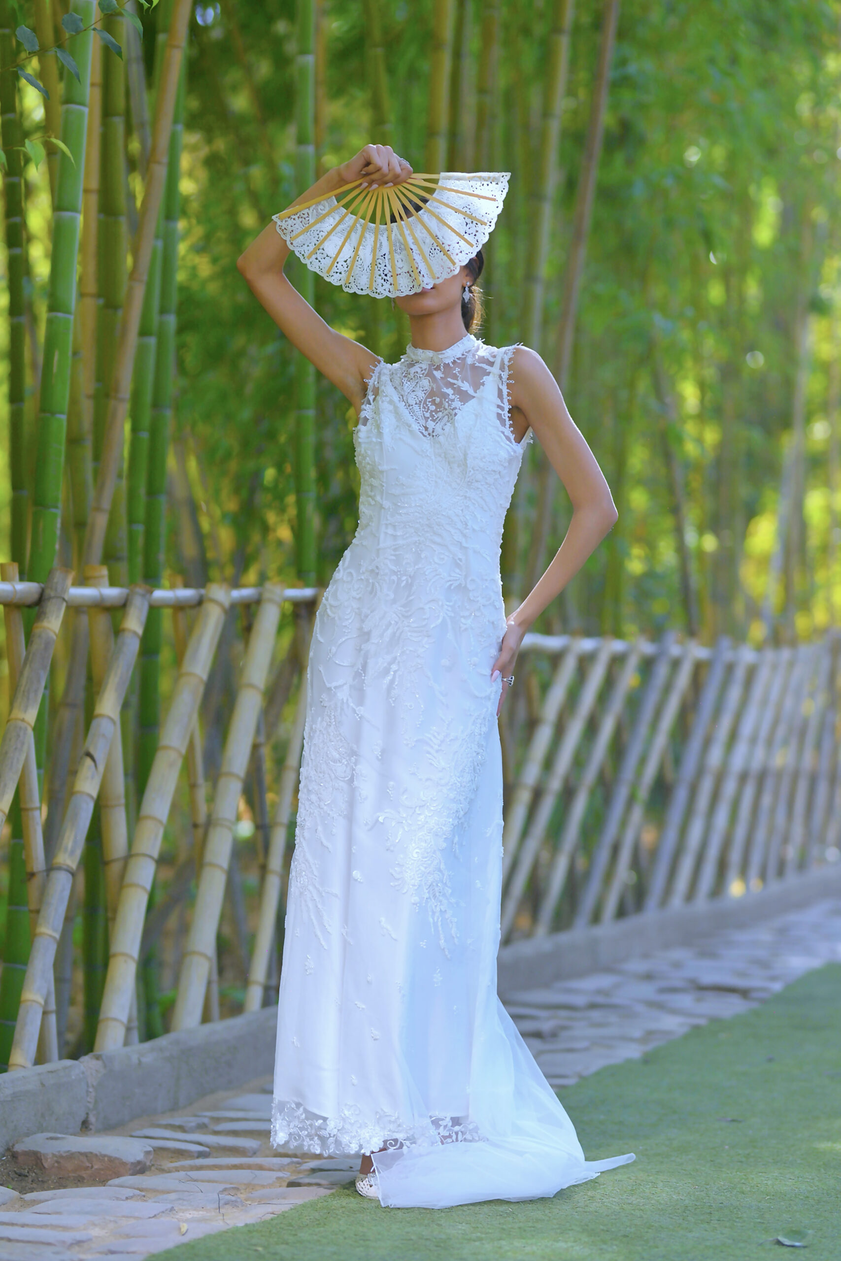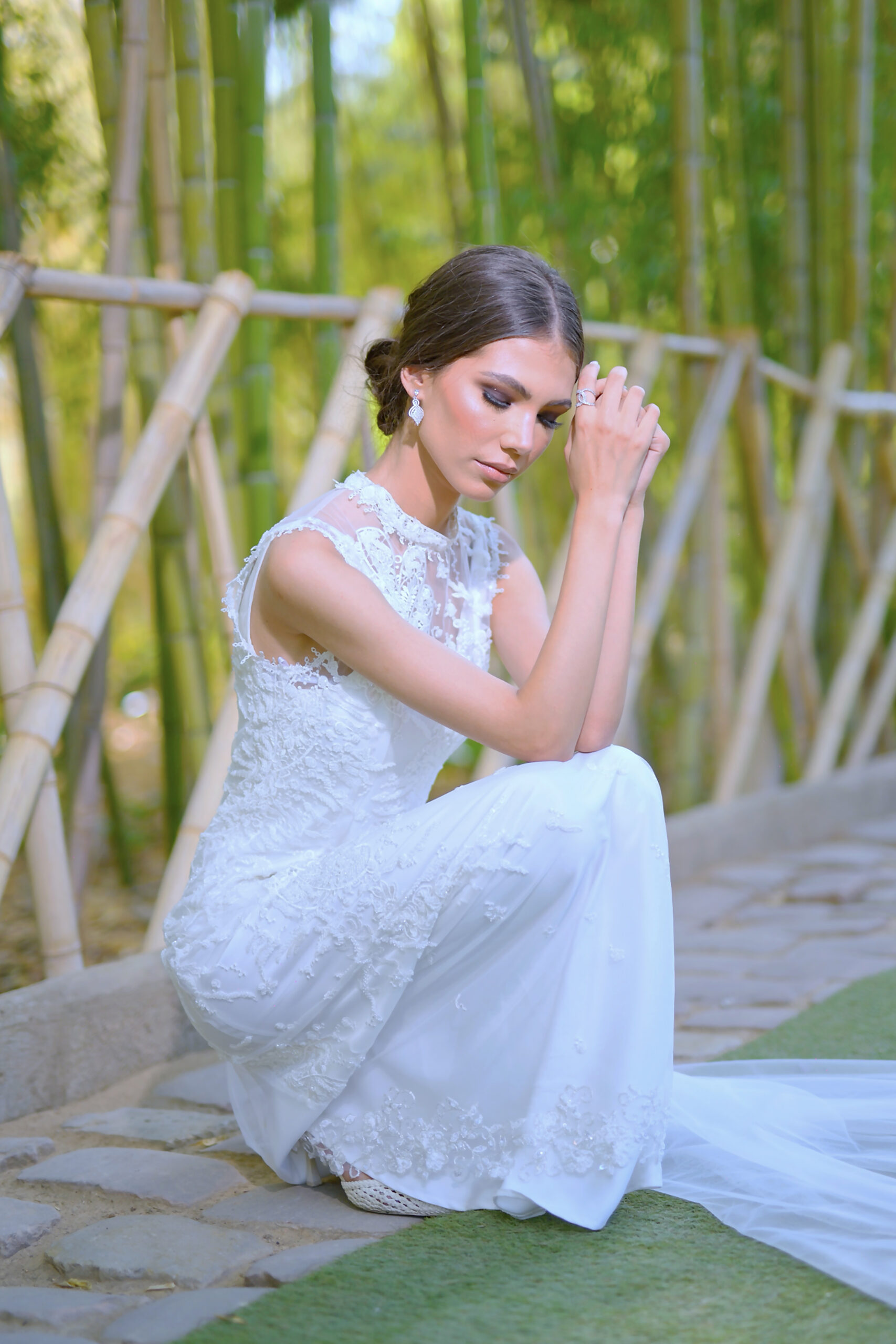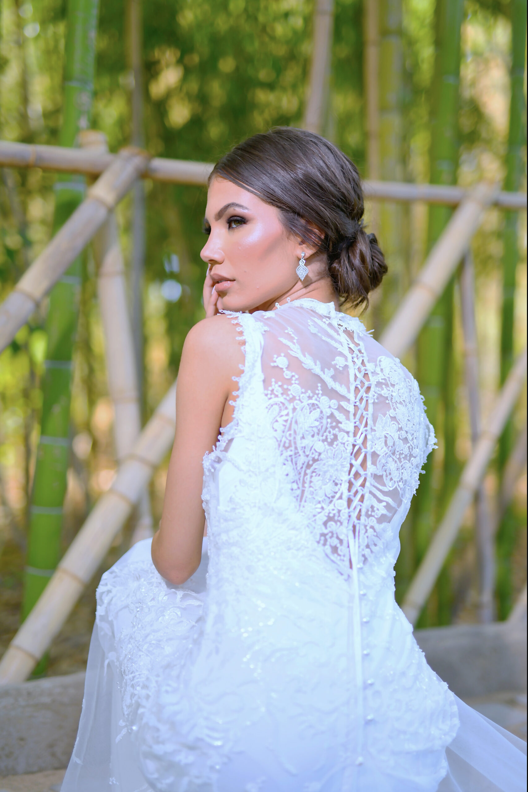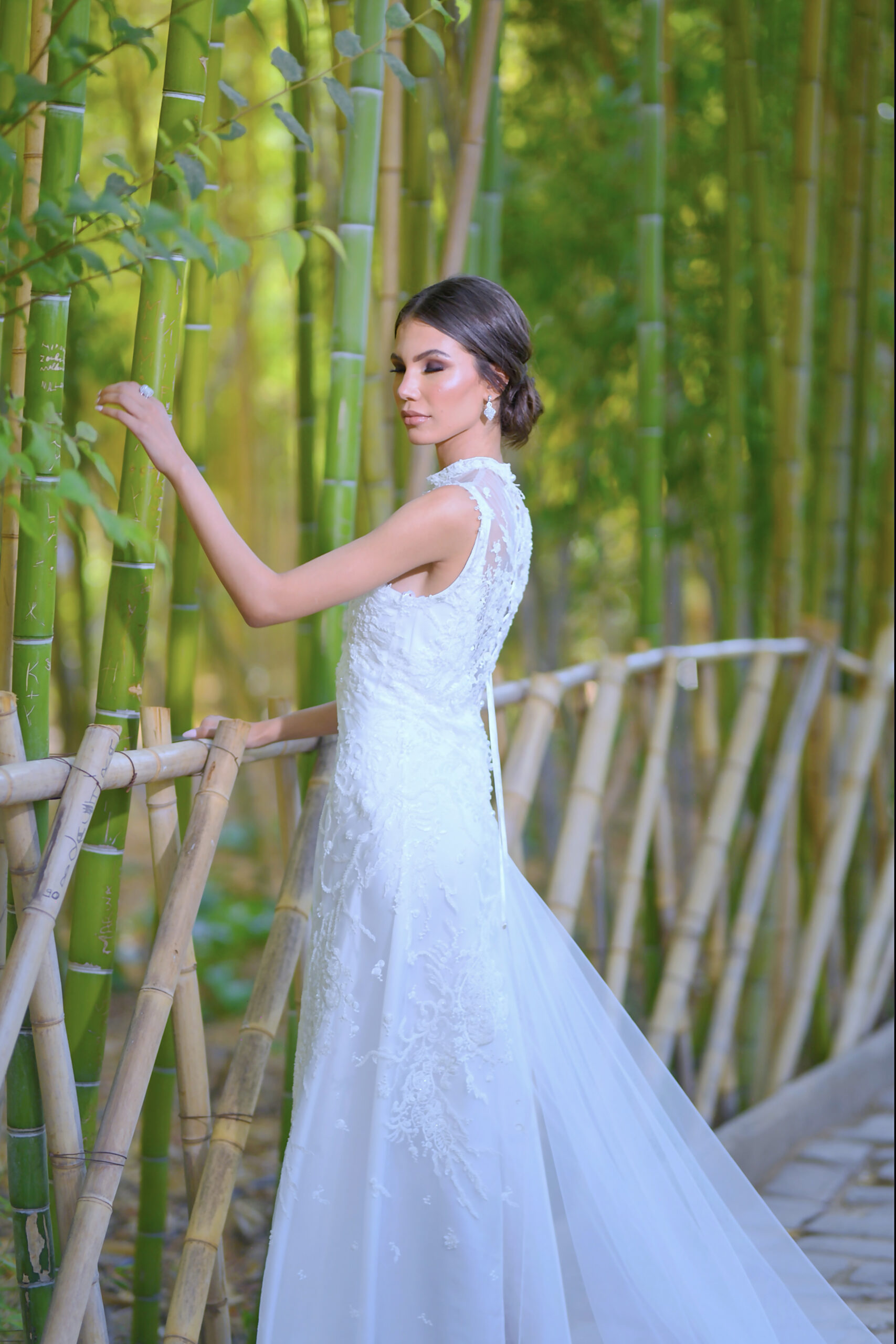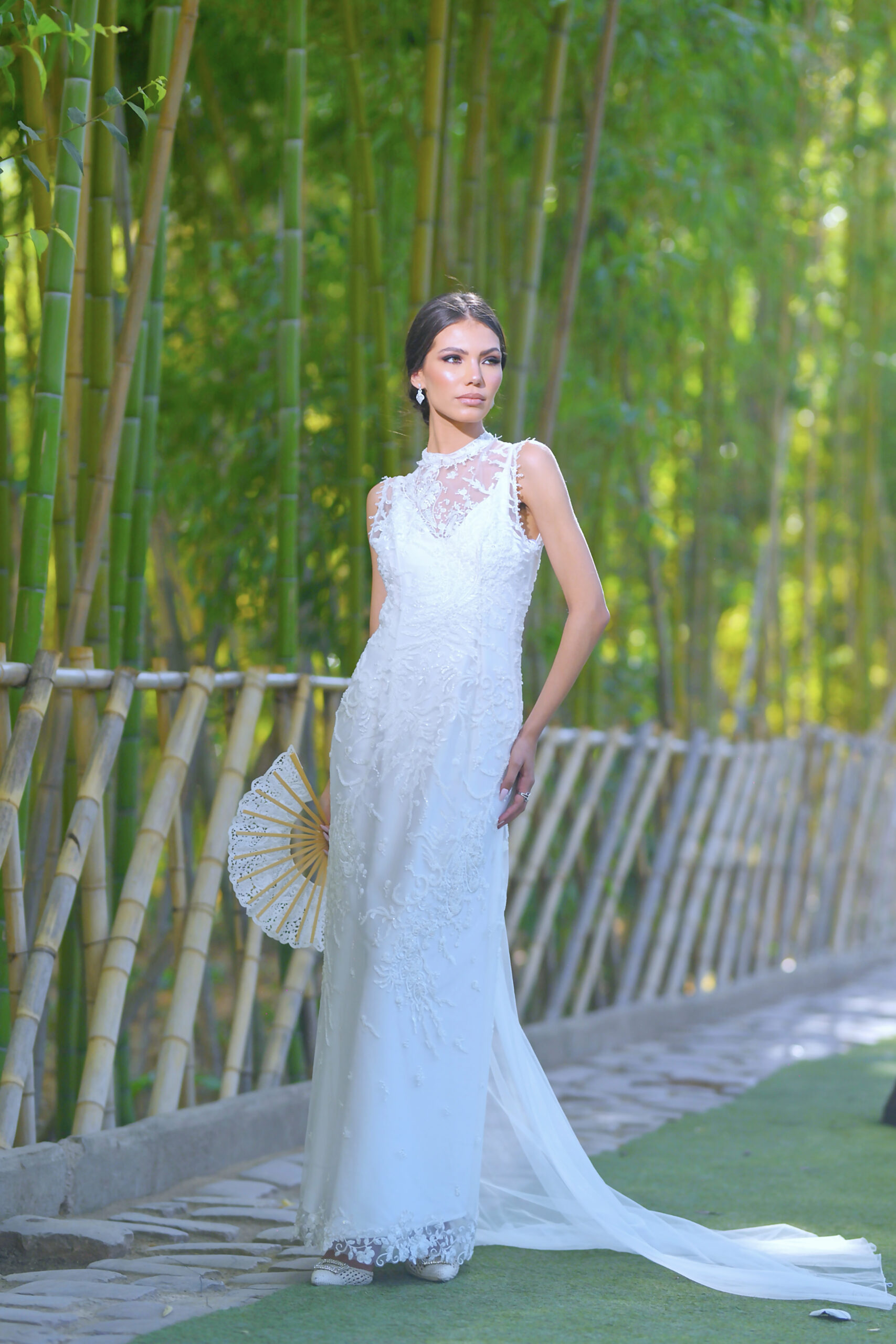 Amyra se distingue par son élégance souveraine. Entièrement perlée, cette pièce au corsage finement orné de motifs s’accorde à une robe en drap de soie majestueuse, soulignée par une traîne en tulle. Amyra incarne la maîtrise du savoir-faire de la Maison, offrant à la mariée une allure gracieuse, confiante et rayonnante.