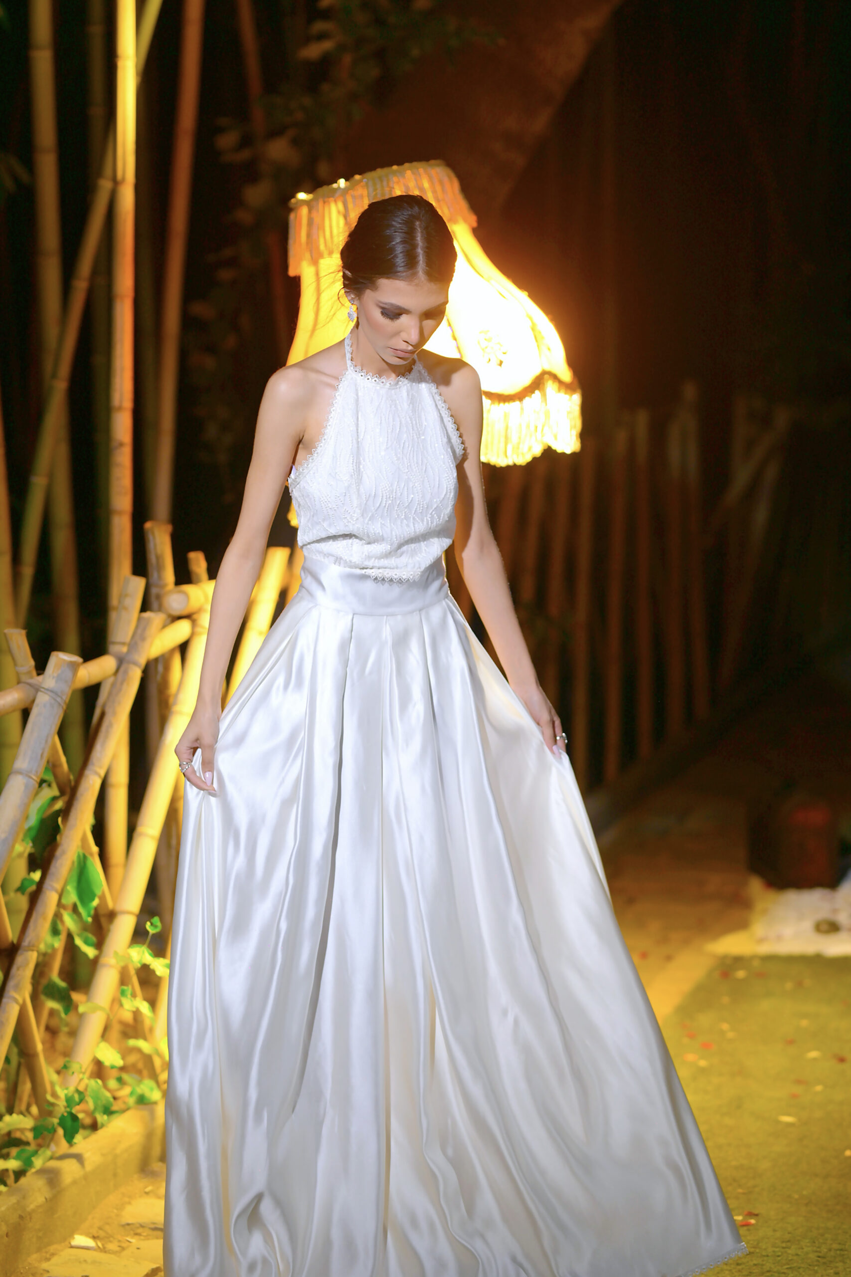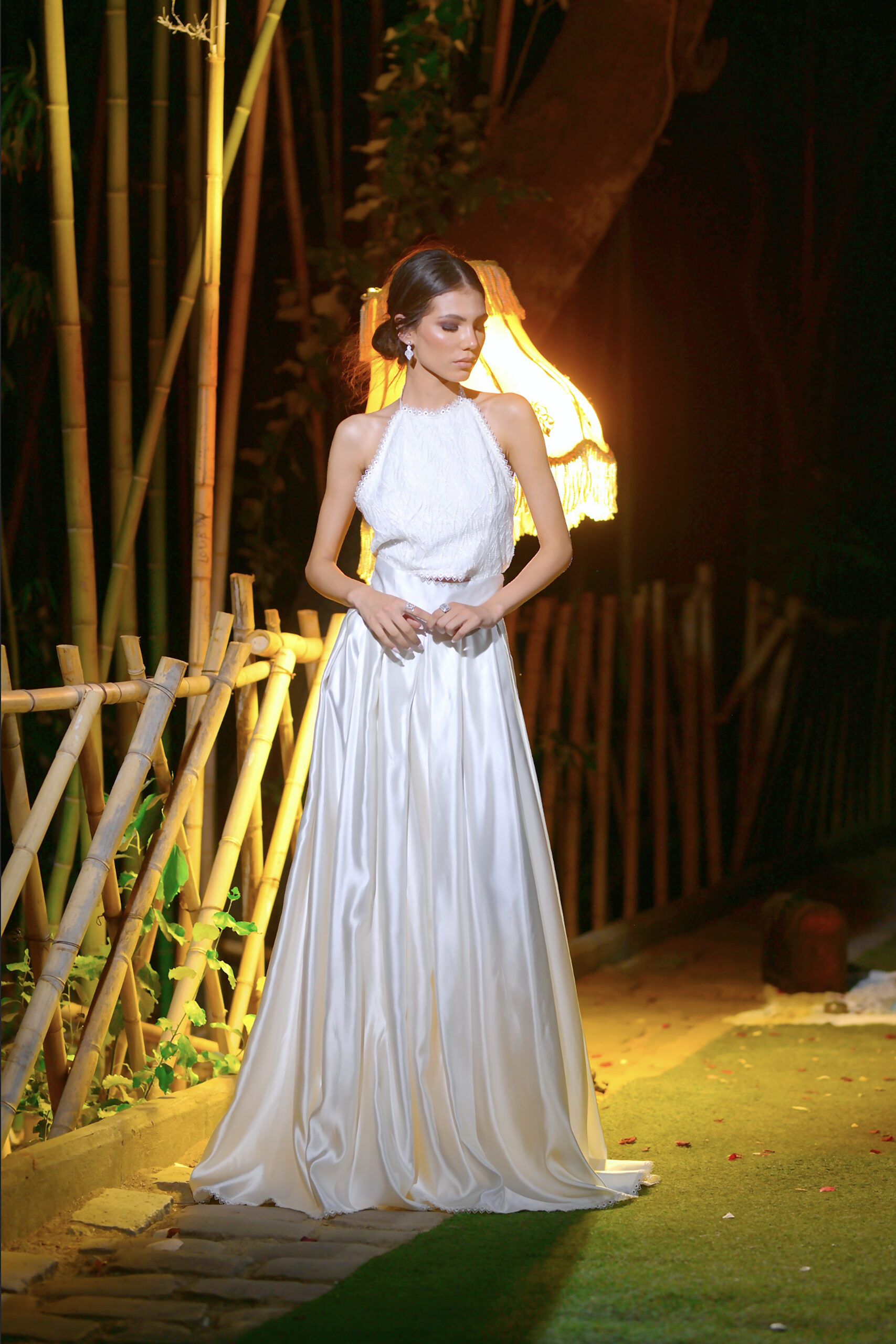 Elysia une pièce raffinée offrant un top en dentelle au dos corseté, un maintien ajusté, glissé avec élégance, associé à une jupe fluide qui accompagne chaque mouvement. Une création pensée pour sublimer la mariée lors d’un mariage civil, d’une cérémonie intime, d’une soirée élégante ou de tout instant où l’élégance se veut inoubliable.