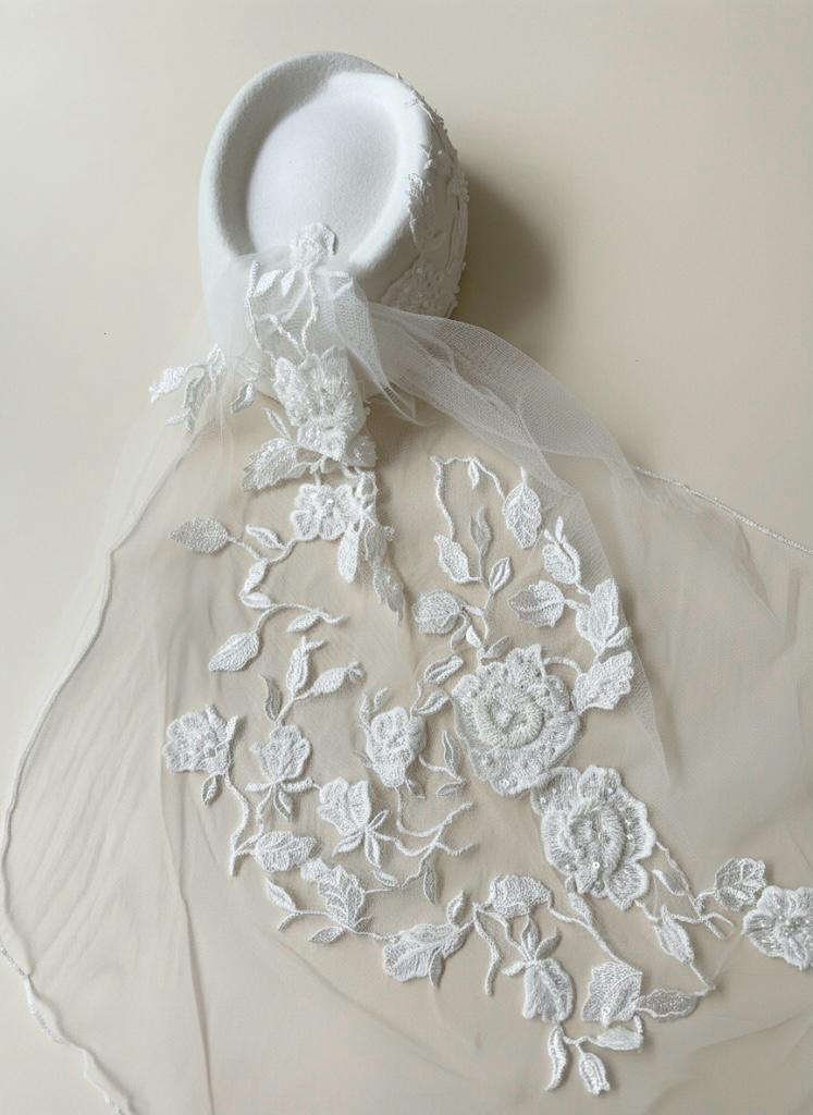 - Ornementation : Voilette brodée de motifs floraux fins et rehaussée de perles discrètes.