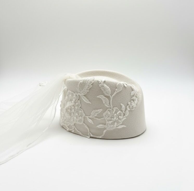 - Matière : Feutre de laine vierge haut de gamme associé à une dentelle florale brodée sur un tulle soyeux.