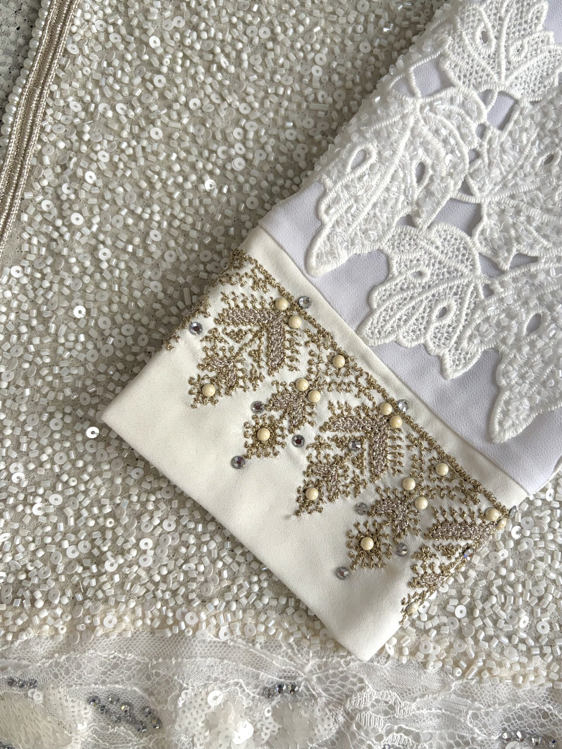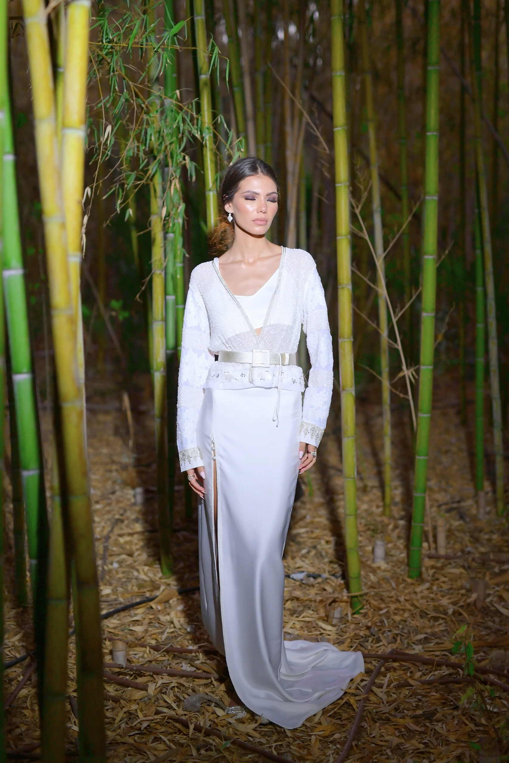 Lyora se dévoile en un ensemble quatre-pièces où chaque détail respire la délicatesse. La broderie perlée, entièrement façonnée à la main « terz El-Fassi », célèbre un savoir-faire précieux. Une silhouette pensée pour le mariage civil, le cocktail de cérémonie, ou tout instant où l’élégance s’impose avec discrétion… et reste inoubliable.