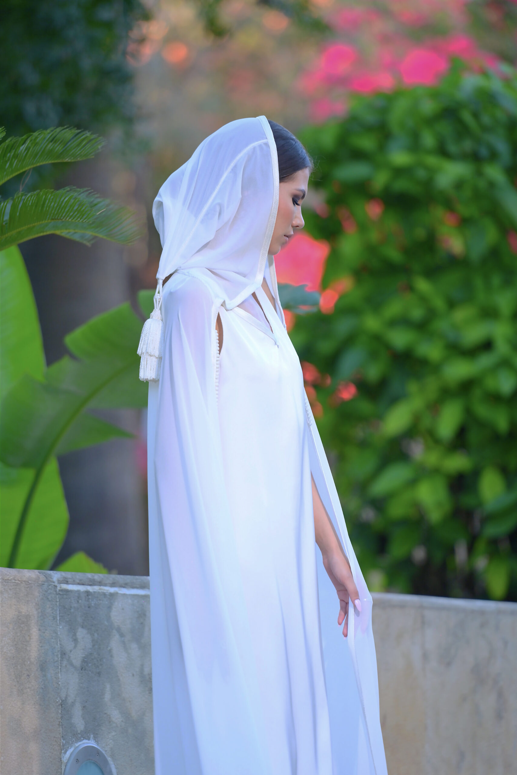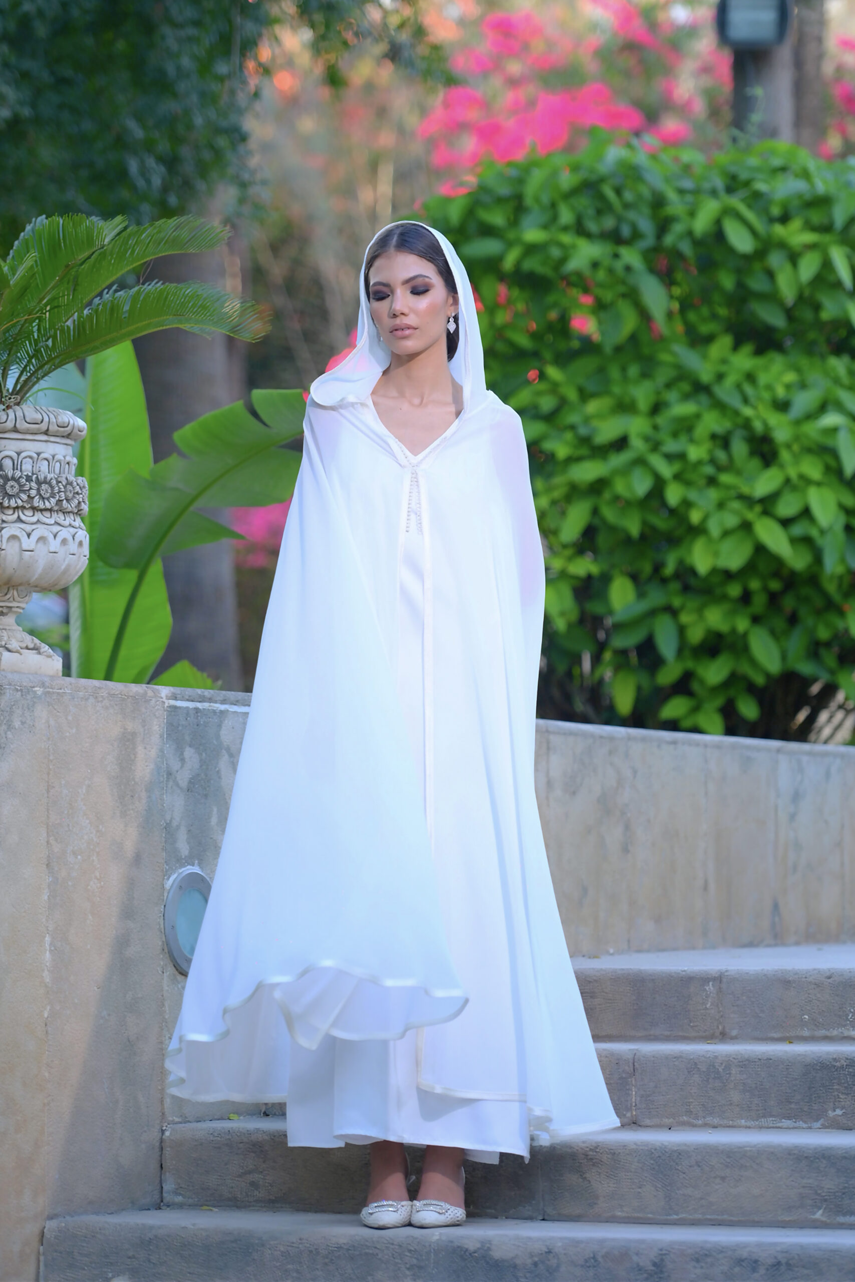 Selham réinvente l’héritage avec une allure d’une modernité subtile. Drapé de mousseline de soie, il enveloppe la silhouette d’une légèreté majestueuse, soulignée par une « sfifa » fine travaillée à la main. Une pièce de tradition magnifiée, pensée pour dialoguer avec la robe et révéler une allure souveraine.