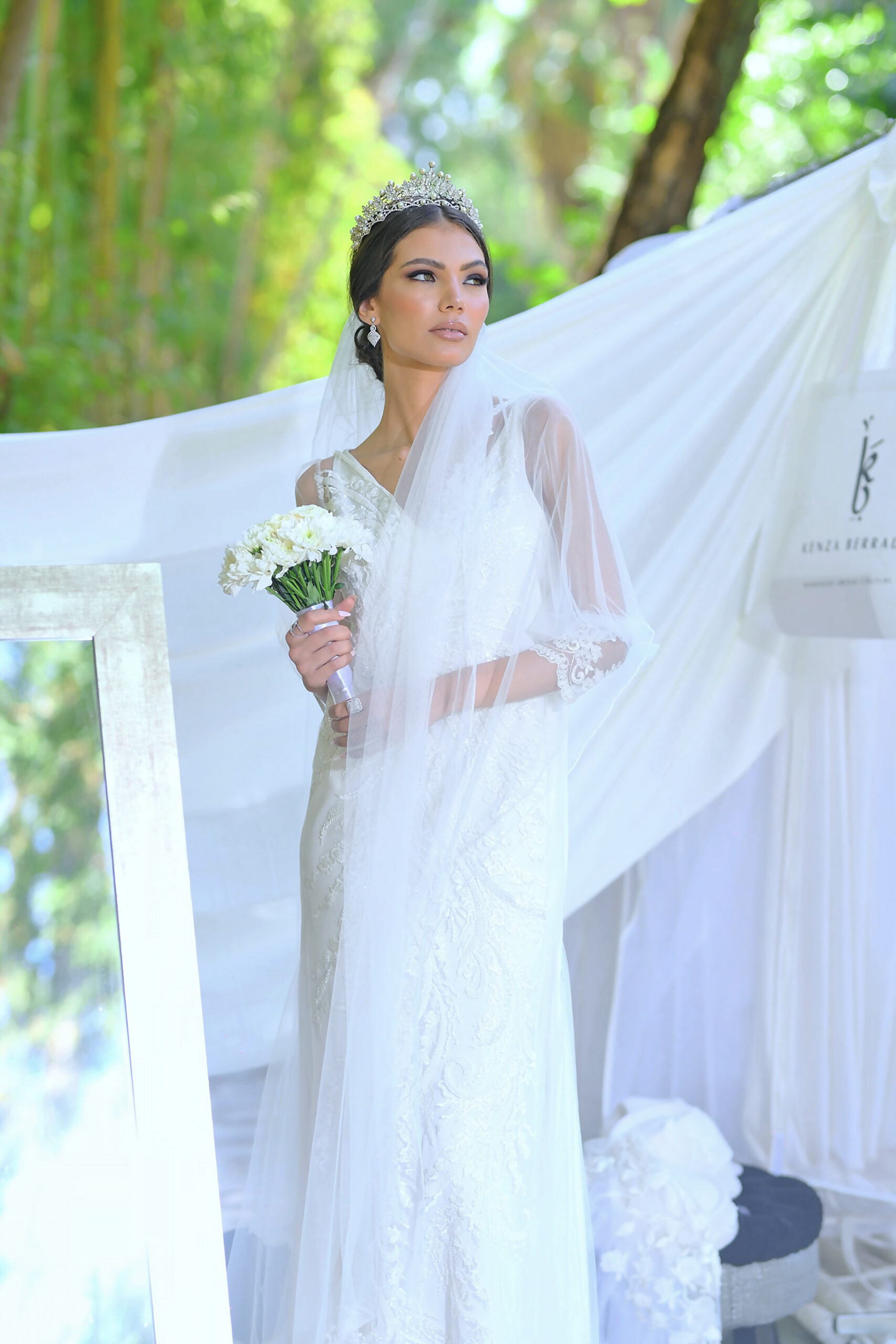 Ce voile délicat vient parfaire la silhouette de la mariée avec légèreté et sophistication. Sur un tulle soyeux blanc ivoire, des broderies et perles minutieusement réalisées à la main captent subtilement la lumière, révélant l’excellence d’un savoir-faire raffiné.